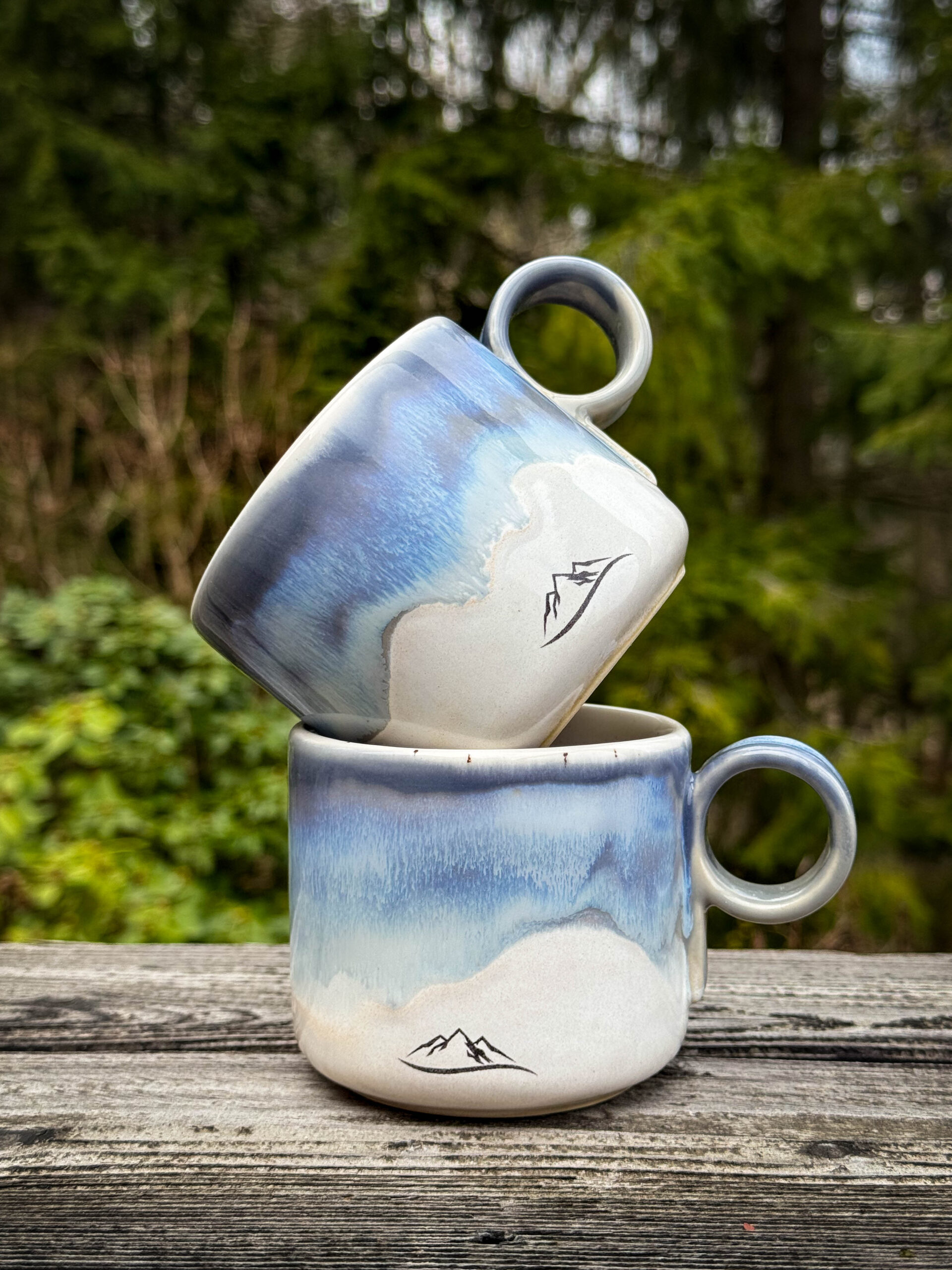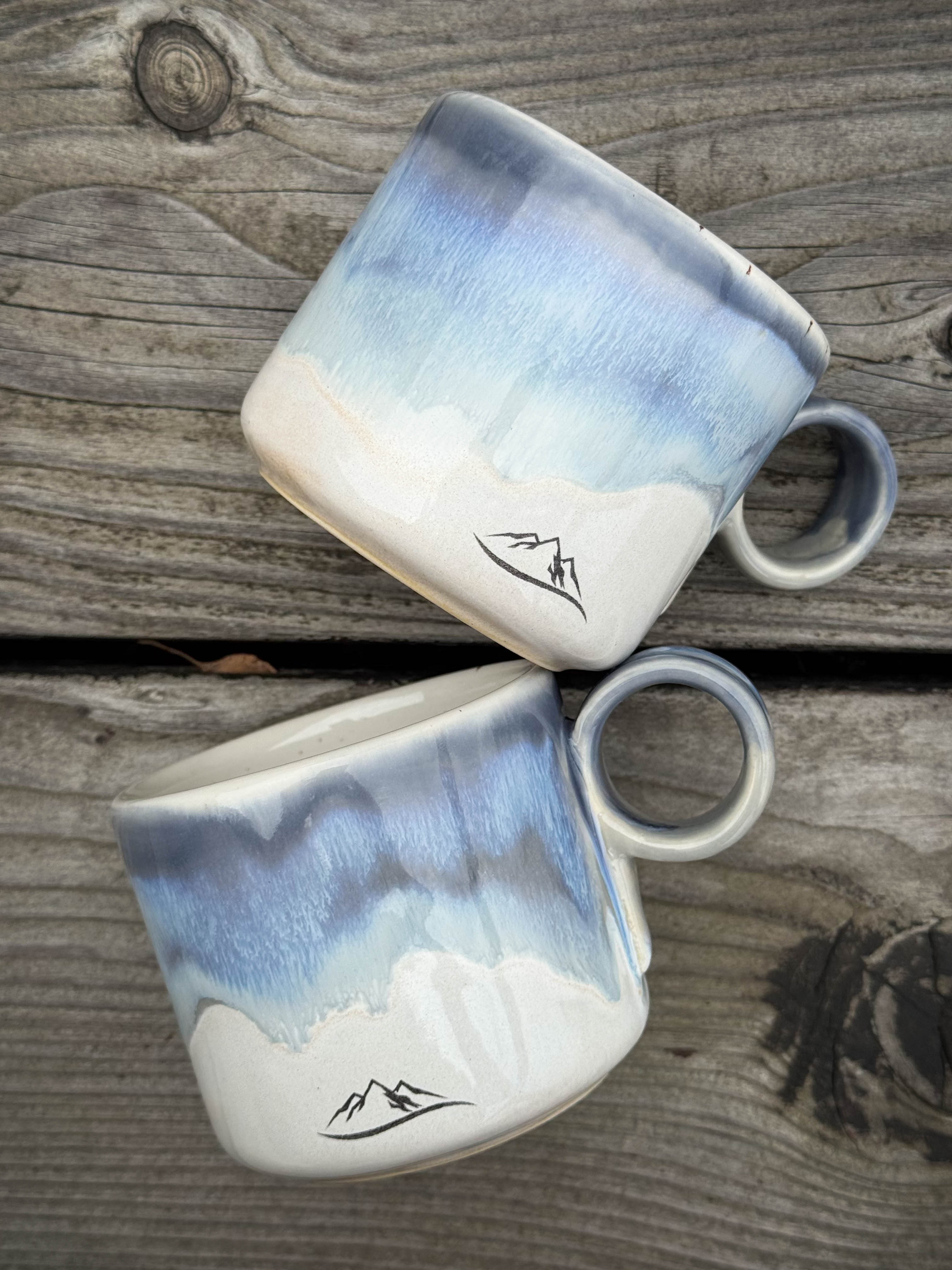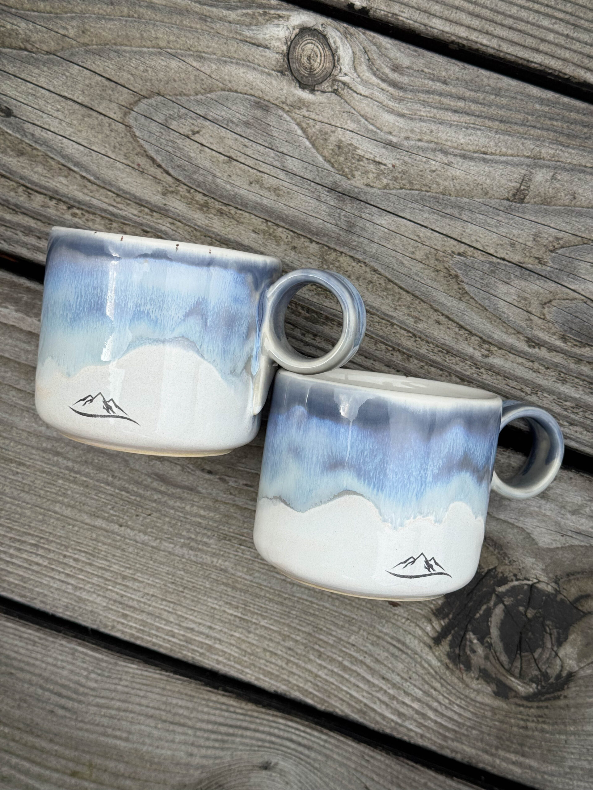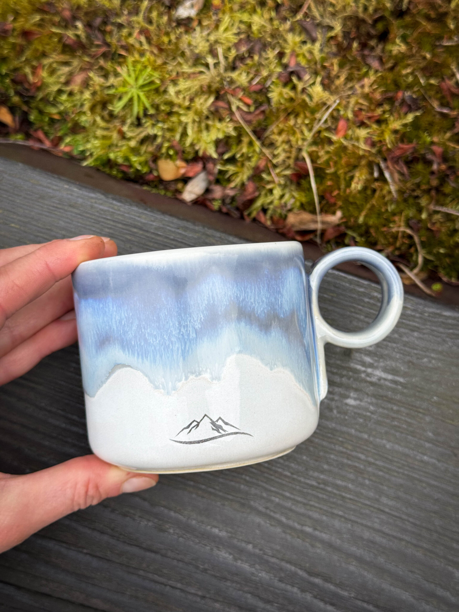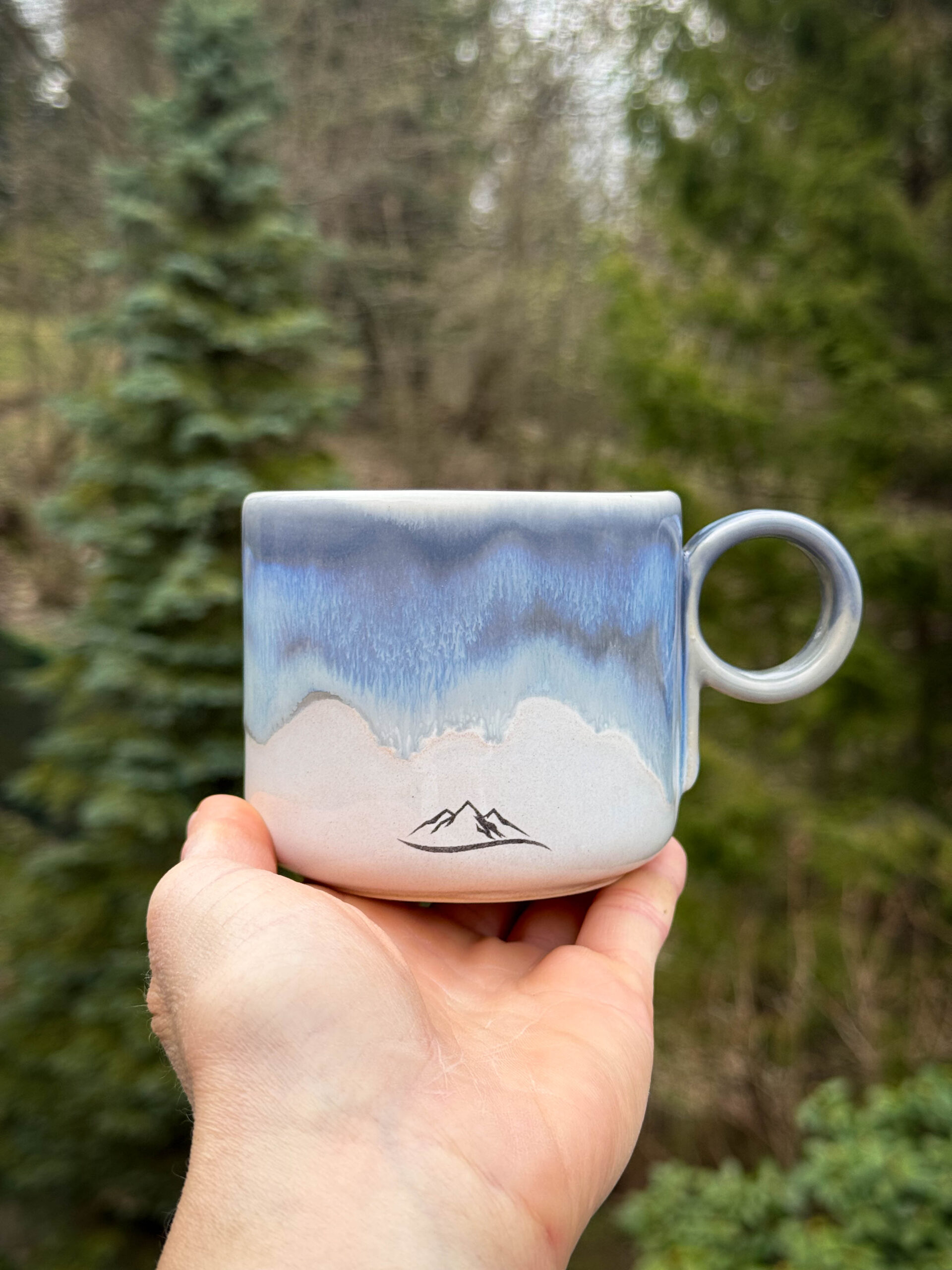 Minimalistyczny i bardzo praktyczny kubek z okrągłym uchem sygnowany rysunkiem gór.