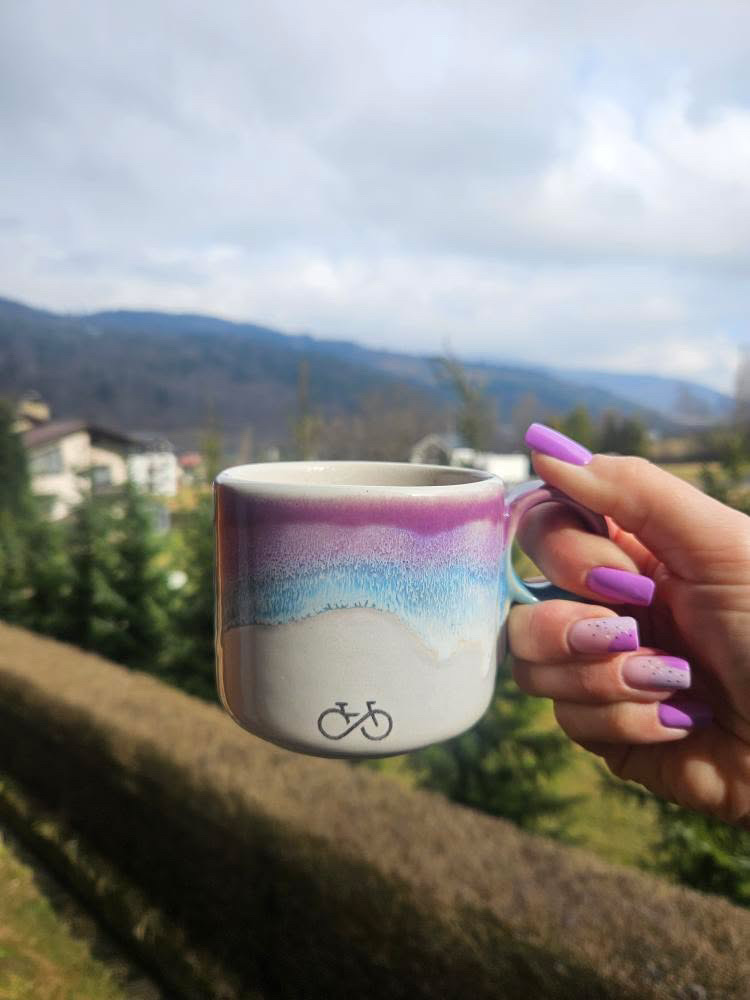 Minimalistyczny i bardzo praktyczny kubek z okrągłym uchem sygnowany rowerowym rysunkiem.