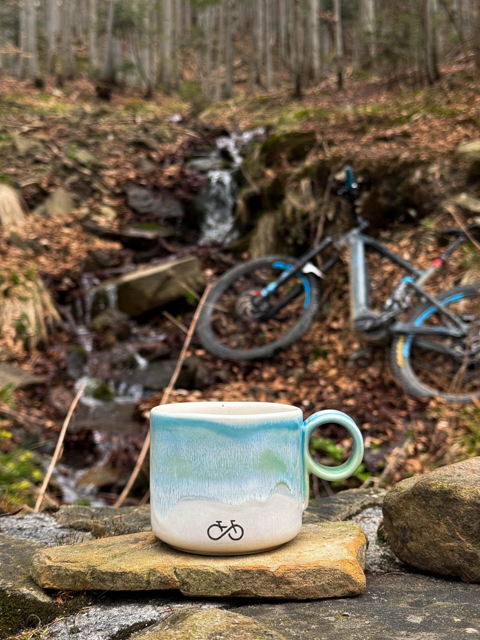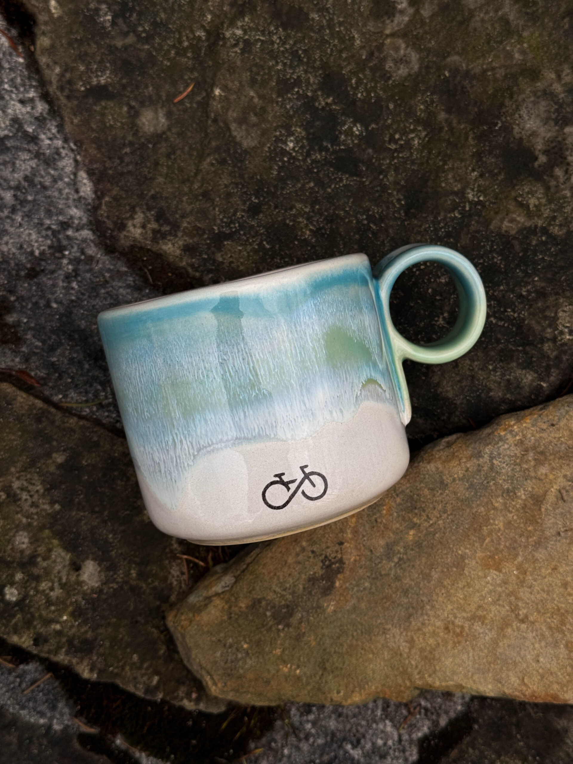 Minimalistyczny i bardzo praktyczny kubek z okrągłym uchem sygnowany rowerowym rysunkiem.