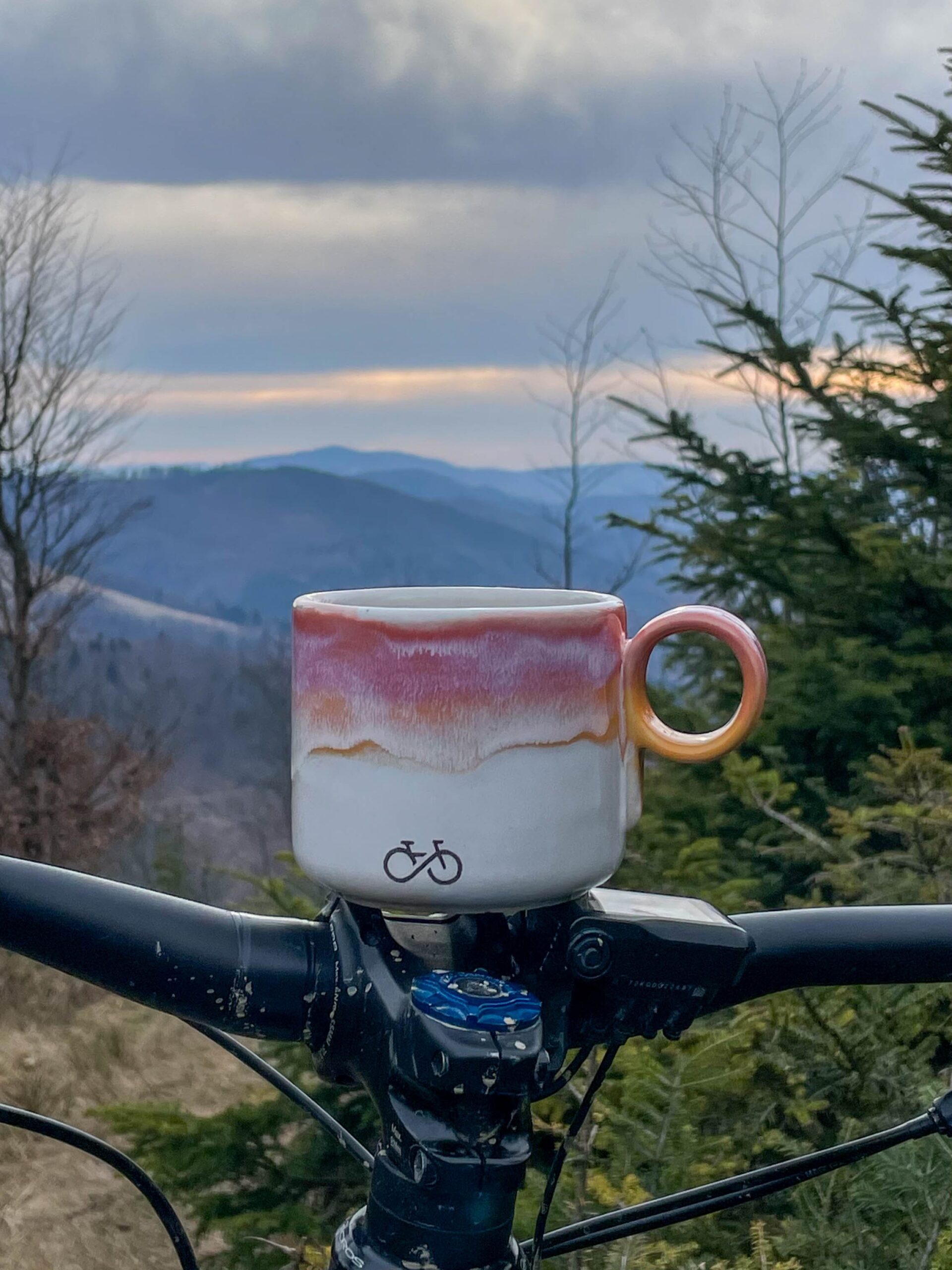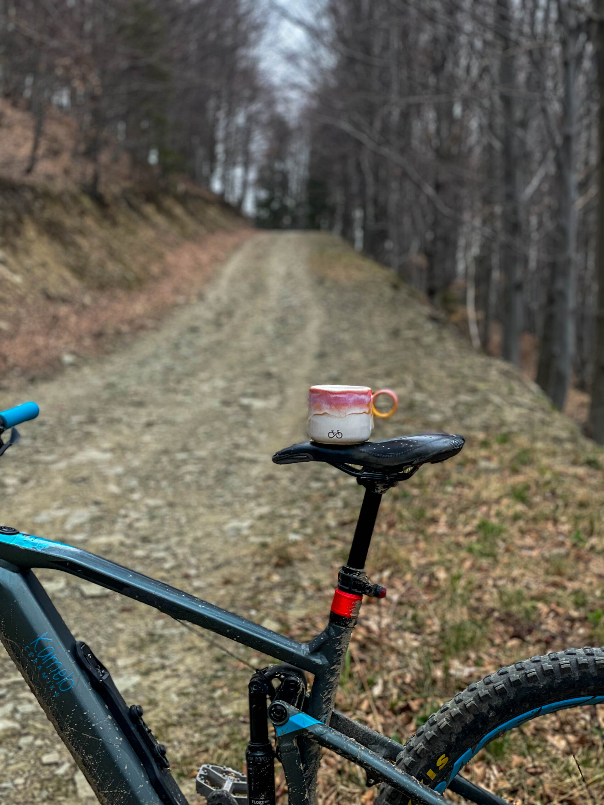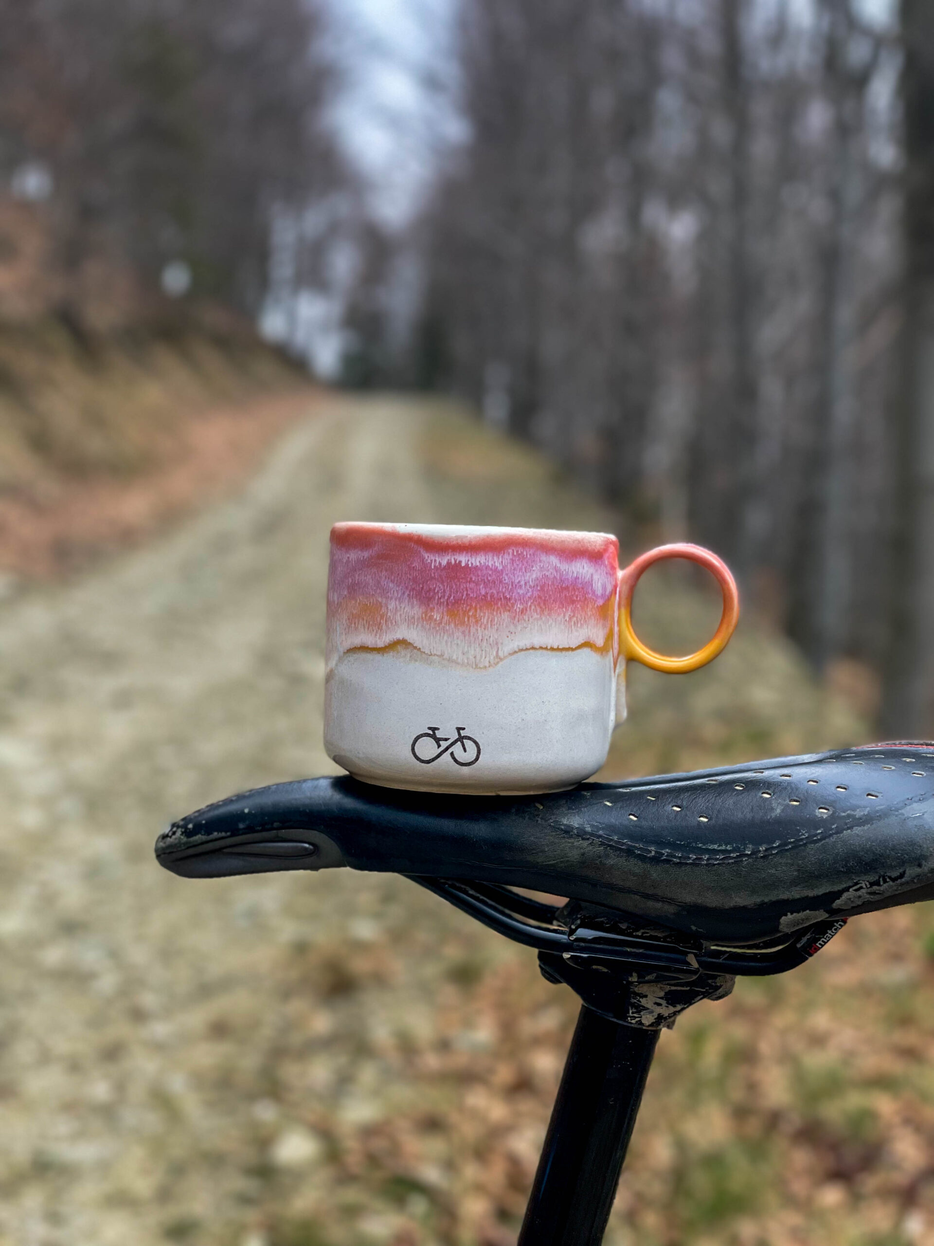 Minimalistyczny i bardzo praktyczny kubek z okrągłym uchem sygnowany rowerowym rysunkiem.