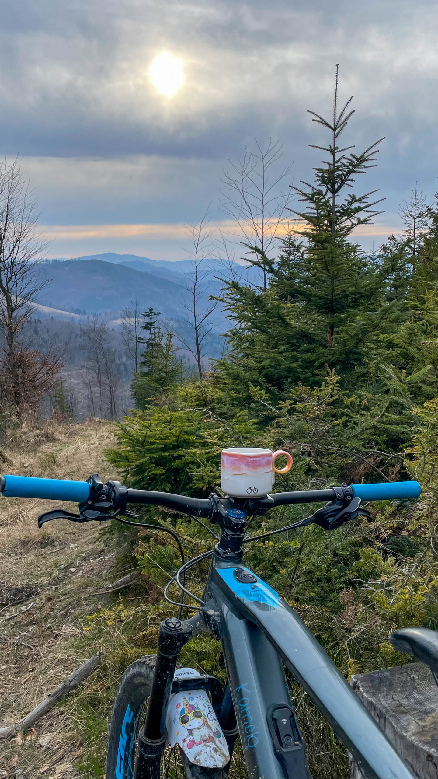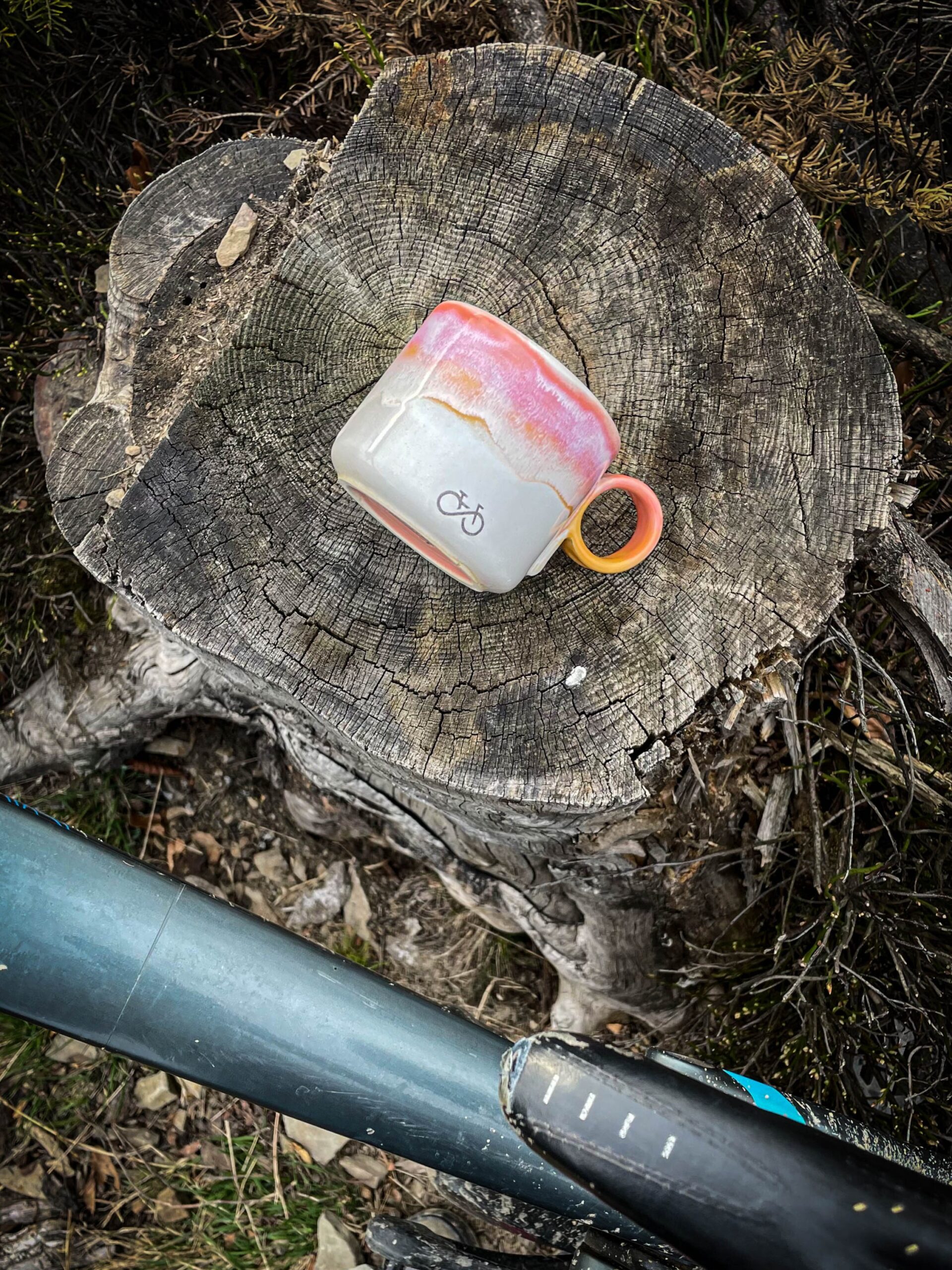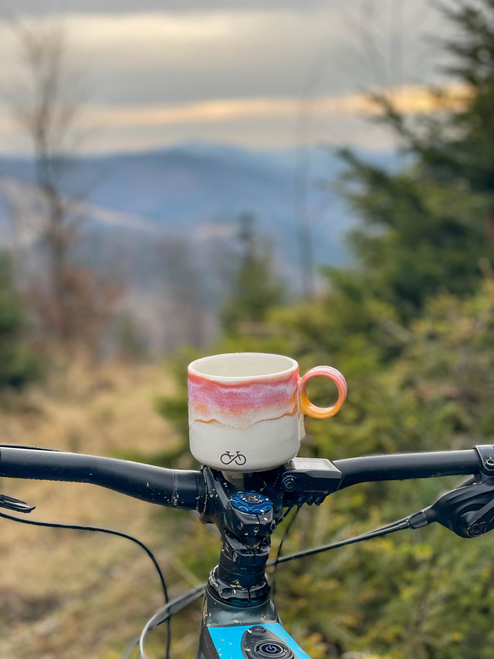 Minimalistyczny i bardzo praktyczny kubek z okrągłym uchem sygnowany rowerowym rysunkiem.
